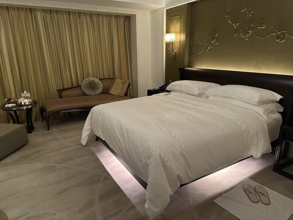 這次入住的「豪華客房」,房間整體設計優雅大氣,一走進房內首先是一個獨立的廁所,接著是豪華大理石浴室及獨立衣帽間,由英國室內設計師 Elli Popp手繪的洗手間手工壁紙、法國香氛Diptyque獨家打造的沐浴備品,都能讓疲倦的旅人得到完全放鬆。床的背板是由英國設計師Helen Amy Murray在橄欖綠色小牛皮革床板上、手工雕琢一朵朵象徵富貴與喜氣的牡丹花,搭配由席夢思床墊、美國Quivera棉質床單、鵝毛羽絨寢具及6種枕頭選擇等種種頂級配備,相信在這裡絕對能一夜好眠。