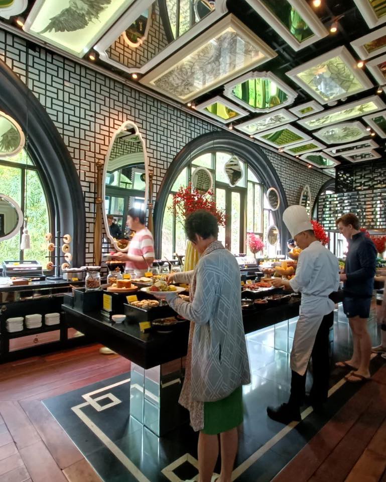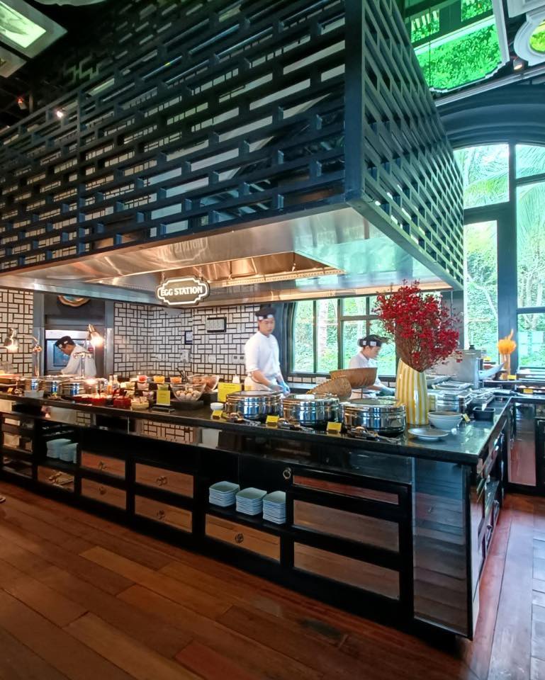 早餐部分在 Citron 餐廳,如果早點前往用餐,有機會坐在著名的打卡位置,斗笠懸空的座位區。早餐選擇也是相當豐富,各式料理應有盡有,而且蛋料理區、越式料理區都有專人廚師現點現做,而且旁邊立刻有服務生詢問是坐哪一桌,所以只要點餐完後就可以直接回座位等待享用,還有小餐車有現做的法國麵包。如果預訂的專案未含早餐,則加點的費用為一天 70 美金 / 2 客早餐,以酒店其他餐飲消費也是很高的情況下,建議大家可以購買含早的方案,吃飽一點可以省下午餐的費用了。